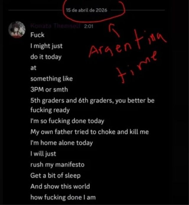 İddiaya göre, saldırgan genç Discord adlı mesajlaşma uygulamasında okulu silahla basacağını ve bir katliam gerçekleştireceğini belirtti. Mersinli, yazışmalarda “Bunu bugün yapabilirim. Öğleden sonra 3 ya da o sıralarda. Bu dünyaya ne kadar tükendiğimi göstereceğim” ifadelerini kullandı.