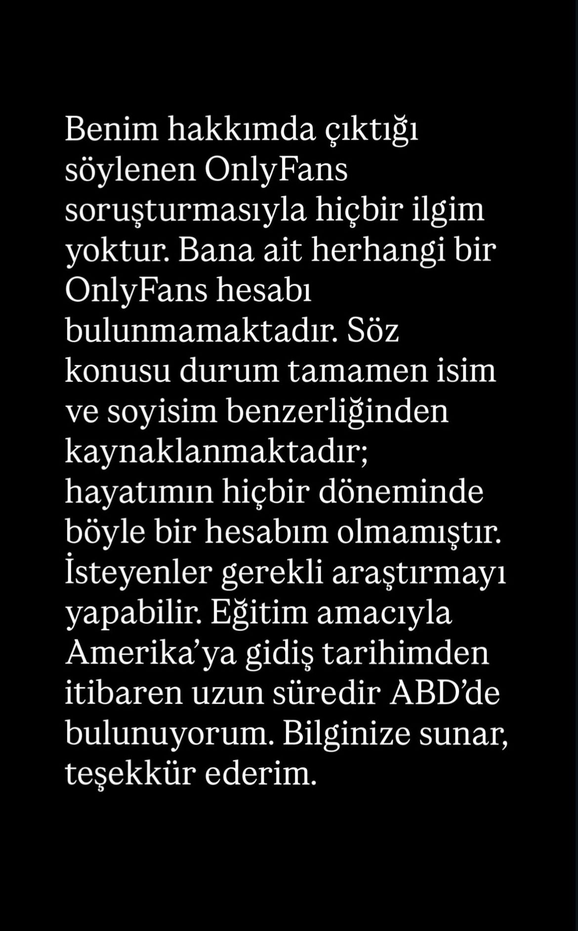 Olayda hiçbir ilgisinin bulunmadığını söyleyen Alkan, “Benim hakkımda çıktığı söylenen OnlyFans soruşturmasıyla hiçbir ilgim yoktur. Bana ait herhangi bir OnlyFans hesabı bulunmamaktadır. Söz konusu durum tamamen isim ve soyisim benzerliğinden kaynaklanmaktadır; hayatımın hiçbir döneminde böyle bir hesabım olmamıştır. İsteyenler gerekli araştırmayı yapabilir.Eğitim amacıyla Amerika’ya gidiş tarihimden itibaren uzun süredir ABD’de bulunuyorum. Bilginize sunar, teşekkür ederim" dedi.