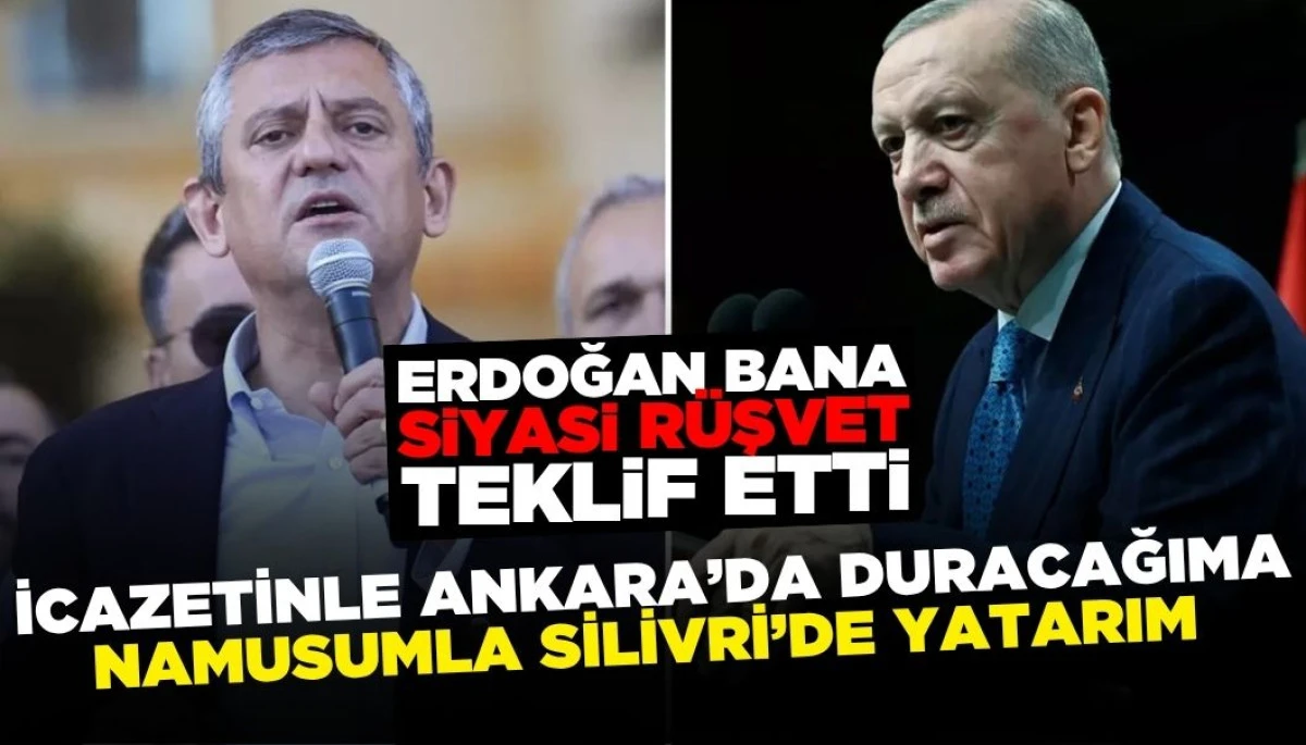 CHP Genel Başkanı Özgür Özel, partisinin olağanüstü MYK toplantısı sonrası yaptığı açıklamada, Cumhurbaşkanı Erdoğan'ın kendisine "siyasi rüşvet" teklif ettiğini öne sürdü. “Senin icazetinle Ankara’da duracağıma, namusumla Silivri’de dururum” dedi.