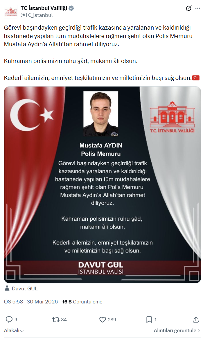 İstanbul Valiliği'nden yapılan açıklamada: “Görevi başındayken geçirdiği trafik kazasında yaralanan ve kaldırıldığı hastanede yapılan tüm müdahalelere rağmen şehit olan Polis Memuru Mustafa Aydın’a Allah’tan rahmet diliyoruz. Kahraman polisimizin ruhu şâd, makamı âli olsun. Kederli ailemizin, emniyet teşkilatımızın ve milletimizin başı sağ olsun” ifadelerine yer verildi.
