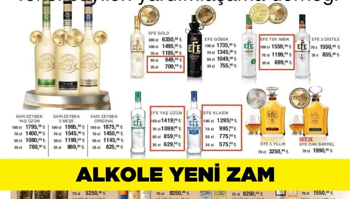 Alkole bir zam daha geldiEfe Grubu’nda yer alan içkilere maliyet zammı geldi. En ucuz rakı 575 Lira en pahalısı 15 bin Lira oldu.