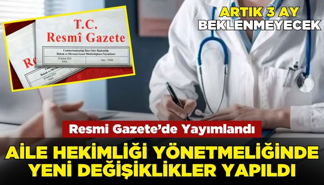 Sağlık Bakanlığı, 'Aile Hekimliği Uygulama Yönetmeliği'nde değişiklik yaptı. Yapılan yeni düzenlemeler Resmi Gazete'de yayımlandı. Yeni yönetmelikle aile hekimliği değişikliği kolaylaştırılırken, aile sağlığı merkezlerinin sayısının artırılacağı açıklandı.