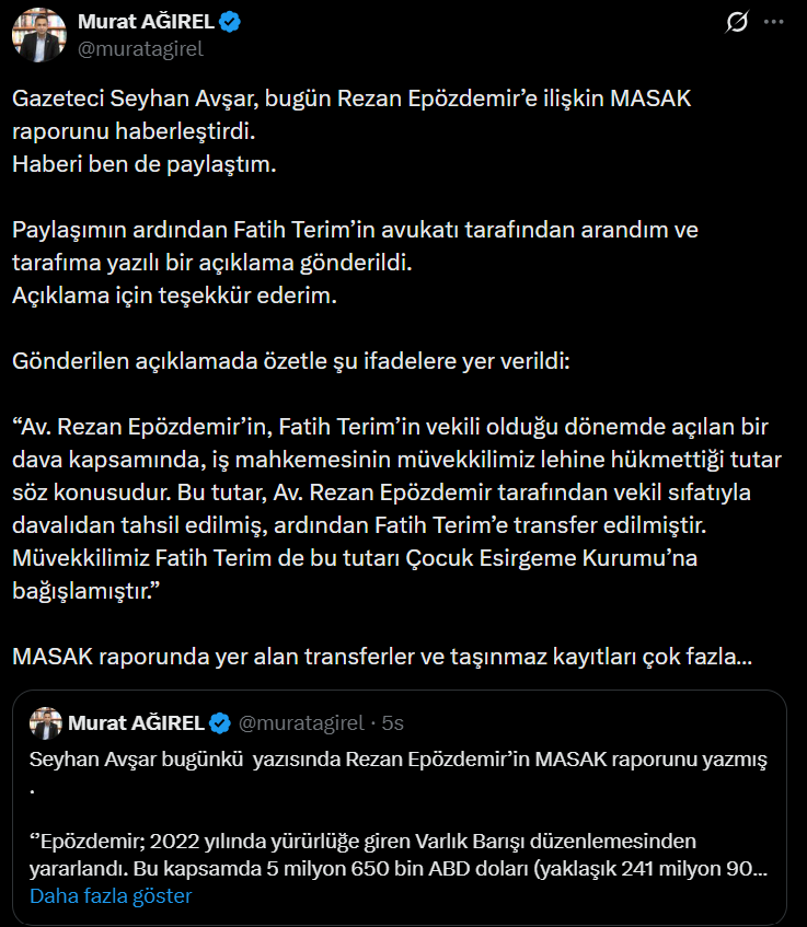 “Av. Rezan Epözdemir’in, Fatih Terim’in vekili olduğu dönemde açılan bir dava kapsamında, iş mahkemesinin müvekkilimiz lehine hükmettiği tutar söz konusudur. Bu tutar, Av. Rezan Epözdemir tarafından vekil sıfatıyla davalıdan tahsil edilmiş, ardından Fatih Terim’e transfer edilmiştir. Müvekkilimiz Fatih Terim de bu tutarı Çocuk Esirgeme Kurumu’na bağışlamıştır.”