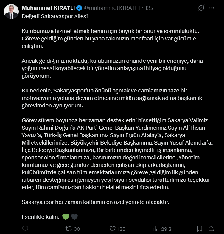 Sakaryaspor Kulübü Başkanı Muhammet Kıratlı, sosyal medya hesabından yaptığı açıklama ile başkanlık görevinden istifa ettiğini duyurdu. Kıratlı, kulübün gelecekteki başarısı için "yeni bir enerjiye ve daha yoğun mesai gerektiren bir yönetim anlayışına" ihtiyaç duyulduğunu belirterek, bu kararın kulübün önünü açmak amacıyla alındığını ifade etti.