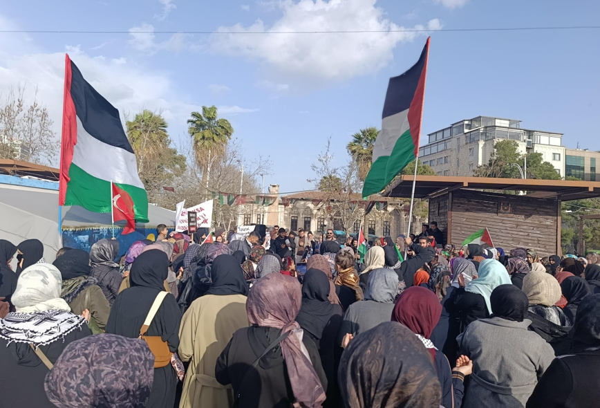 Kadınlar adına açıklama yapan Nirgül Kaşıkçı, "27 Şubat tarihinden beri Kudüs'teki Hristiyan ve Müslüman ibadethaneleri kapatılmıştır. Avrupa'nın baskısı sonuç vermiş Hristiyan ibadethaneleri açılmıştır ancak Mescid-i Aksa 36 gündür hala kapalıdır. Bu kabul edilemez bir hukuksuzluk, inanç özgürlüğüne ağır bir darbedir. Kudüs'ün kalbinde yer alan Müslümanların üç kutsal mekânından biri olan Mescid-i Aksa'nın hak gaspına derhal son verilmesi ve kutsal mekanlara erişiminin sağlanması şarttır. İşgalci bununla da kalmayıp sadece Filistinli Müslüman oldukları için keyfi tutuklama yaptığı bu insanların ölüm fermanlarını nefretle onaylamıştır. İdam cezası hiçbir şartta adaletin yerine getirilmesi için meşru bir araç olamaz. Bu sistematik yok etme politikasını reddediyoruz. Tüm uluslararası kurumları bu hukuksuzluğa sessiz kalmamaya derhal harekete geçmeye çağırıyoruz. İdam kararlarını ve ibadet yasağını durdurmak için diplomatik ve ekonomik tüm yaptırımların derhal hayata geçirilmesi gerekmektedir. Bu konuda her alanda üzerimize düşeni yapmaya hazırız" ifadelerini kullandı.