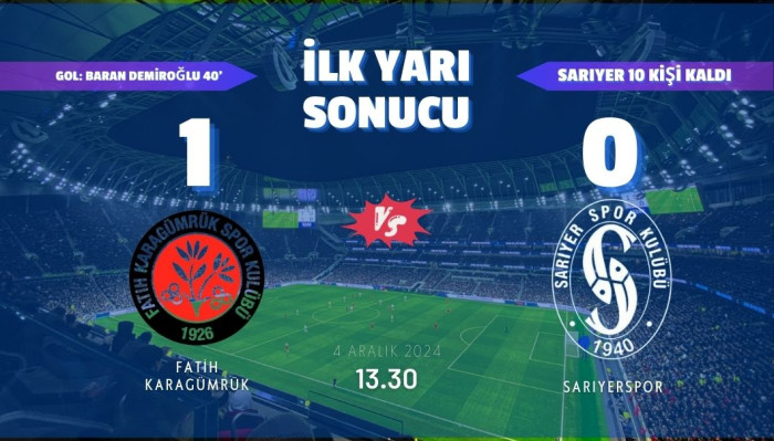 Ziraat Türkiye Kupası 4. Tur karşılaşmasında Sarıyerspor’un rakibi 1. Lig’in üçüncü sırasında yer alan Fatih Karagümrük. Saat 13.’30da başlayankarşılaşmanın ilk yarısını 1-0 geride tamamladı.