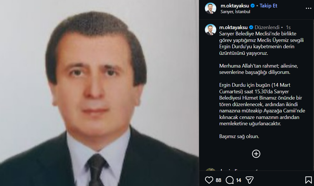 Sarıyer Belediye Başkanı Oktay Aksu, meclis üyesi Ergin Durdu’nun vefat haberini sosyal medya hesabından duyurdu. Taziye mesajının yanı sıra Durdu'nun cenaze programını paylaşan Aksu, aileye başsağlığı dileklerini iletti.
