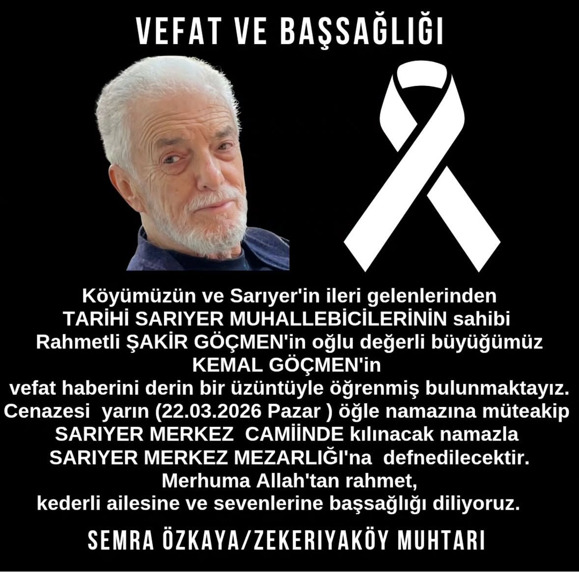 Sarıyer’in tanınmış isimlerinden ve Tarihi Sarıyer Muhallebicileri’nin sahibi Şakir Göçmen’in oğlu Kemal Göçmen hayatını kaybetti. Zekeriyaköy Muhtarı Semra Özkaya tarafından paylaşılan vefat haberi, bölge halkı ve sevenleri arasında büyük üzüntüye neden oldu.