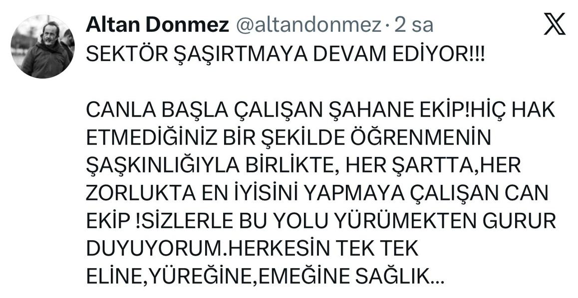 “Sektör şaşırtmaya devam ediyor. Canla başla çalışan şahane ekip, hiç hak etmediği bir şekilde öğrenmenin şaşkınlığını yaşıyor. Her şartta, her zorlukta en iyisini yapmaya çalışan bu ekiple yol yürümekten gurur duyuyorum. Herkesin tek tek eline, yüreğine ve emeğine sağlık.”