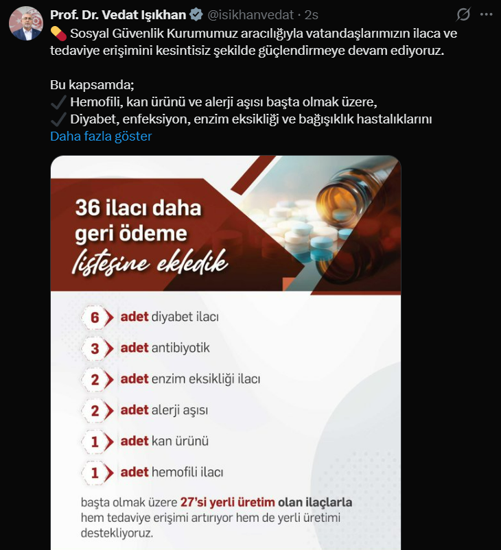 Çalışma ve Sosyal Güvenlik Bakanı Vedat Işıkhan, Sosyal Güvenlik Kurumu (SGK) aracılığıyla vatandaşların tedaviye erişimini güçlendirmek amacıyla 36 ilacın daha geri ödeme listesine alındığını duyurdu. Bakan Işıkhan, sosyal medya üzerinden yaptığı açıklamada, yeni listeye alınan ilaçların büyük bir kısmının yerli üretim olduğunu vurguladı.