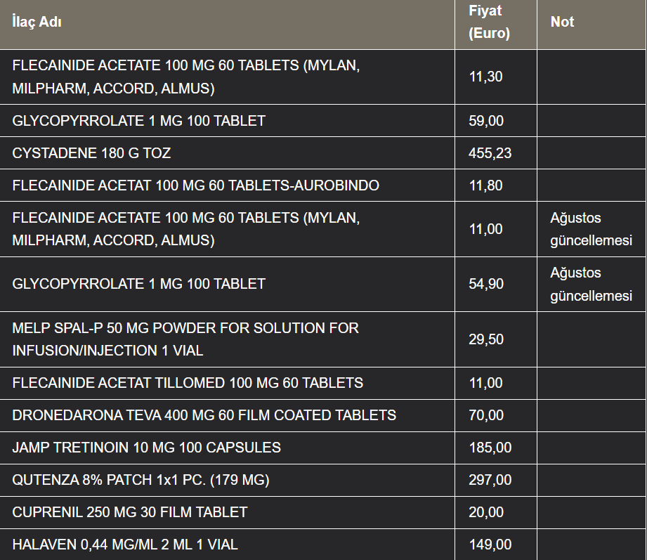 Listede yer alan ilaçların fiyatları şu şekilde;
