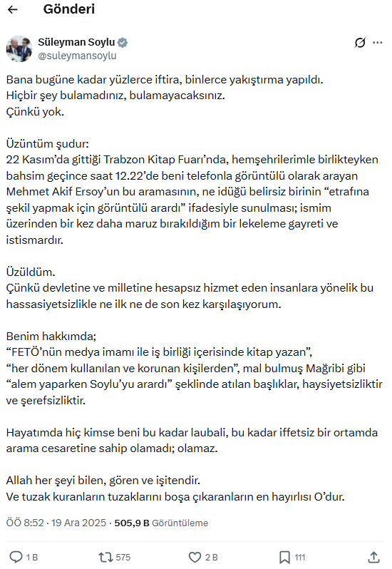 Soylu, 22 Kasım’da Trabzon Kitap Fuarı’nda hemşehrileriyle birlikte olduğu sırada Mehmet Akif Ersoy tarafından saat 12.22’de görüntülü olarak arandığını belirtti. Bu aramanın, kimliği belirsiz kişilerce farklı bir bağlamda sunulduğunu söyleyen Soylu, yaşananların ismi üzerinden yürütülen yeni bir karalama girişimi olduğunu savundu.