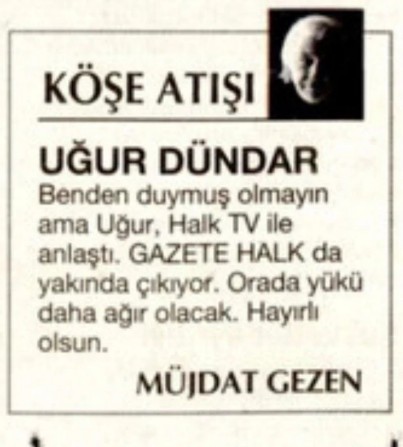 Sözcü Gazetesi'nden ayrıldığını duyuran Uğur Dündar'ın yeni adresi belli oldu. Yakın arkadaşı Sanatçı Müjdat Gezen Dündar'ın Halk TV ile anlaştığını yazdı. Gezen, Cumhuriyet gazetesindeki köşesinde "Benden duymuş olmayın ama Uğur, Halk TV ile anlaştı. Gazete Halk da çıkıyor. Orada yükü daha ağır olacak" diye yazdı.