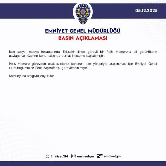 Görüntülerin sosyal medyada yayılmasının ardından Emniyet Genel Müdürlüğü hızla harekete geçti. Emniyet’in resmi X hesabından yapılan açıklamada, polis memurunun görevinden uzaklaştırıldığı ve konuyla ilgili inceleme başlatıldığı duyuruldu.