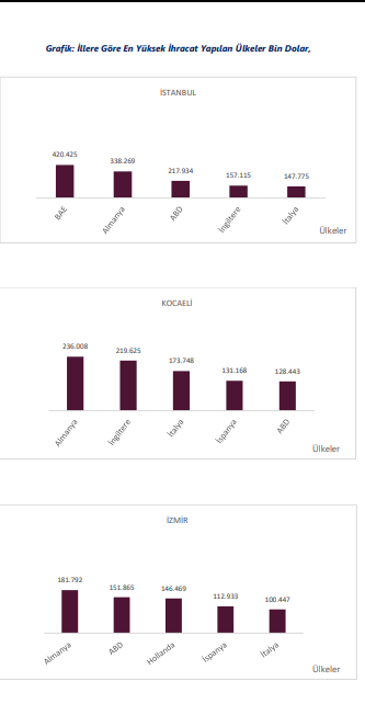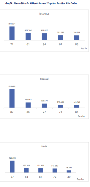 Ticaret Bakanlığı, tarafından açıklanan ocak ayı faaliyet illeri ihracat verilerine göre, Türkiye'nin dış ticaretinde İstanbul, Kocaeli, İzmir ve Bursa 1 milyar doların üzerine çıktı. Ülke genelinde 35 ilde ihracat artışı gerçekleştirildi.