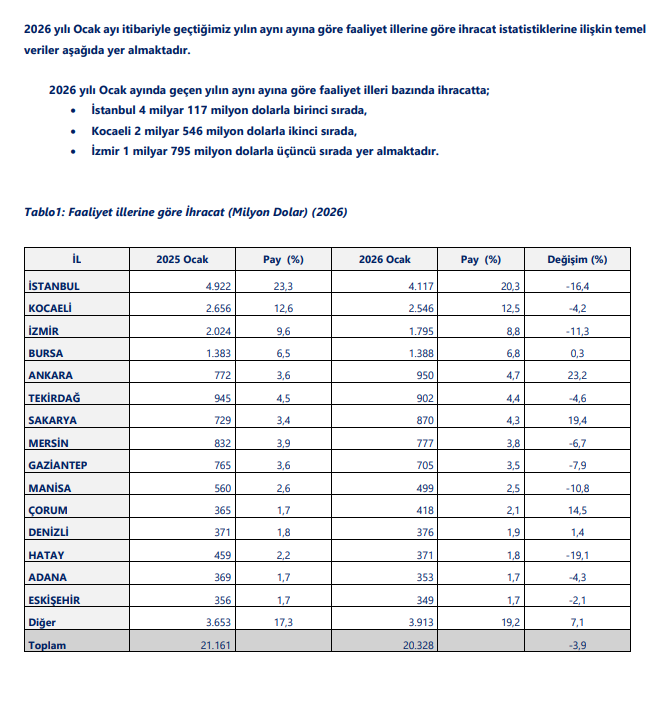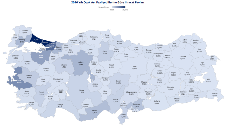 2026 yılı ocak ayında en fazla ihracat yapan ilk üç il sırasıyla İstanbul, Kocaeli ve İzmir oldu.