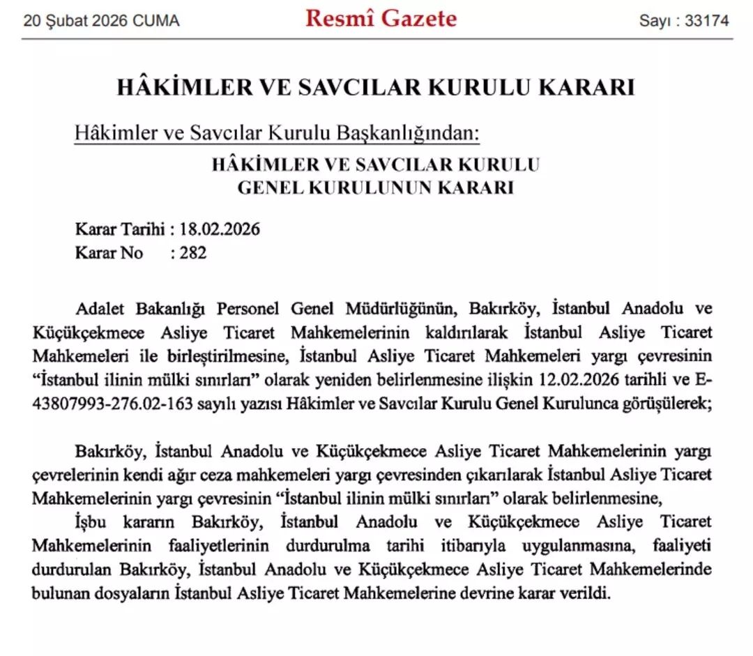 Resmi Gazete'de yayımlanan kararla birlikte ticaret mahkemelerinin yetki alanı ‘tüm İstanbul’ olarak belirlendi.