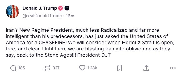 "İran'ın seleflerinden çok daha az radikalleşmiş ve çok daha zeki olan Yeni Rejim Başkanı, az önce Amerika Birleşik Devletleri'nden ATEŞKES istedi! Hürmüz Boğazı açık, özgür ve temiz olduğunda bunu değerlendireceğiz. O zamana kadar İran'ı yok oluşa ya da dedikleri gibi, Taş Devri'ne geri patlatıyoruz!!! Başkan DJT"