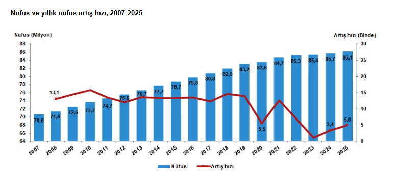 Yıllık nüfus artış hızı 2024 yılında binde 3,4 iken, 2025 yılında binde 5 oldu.