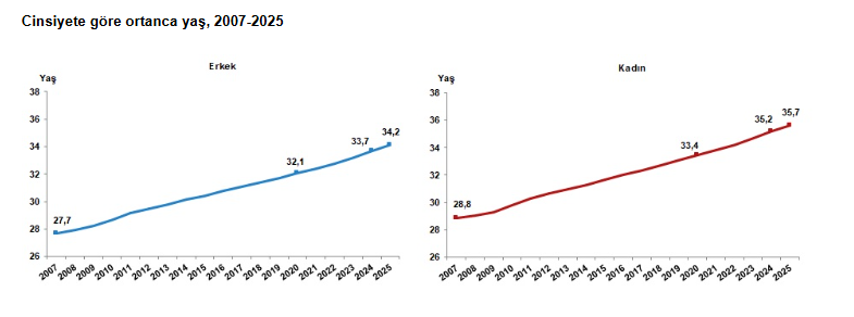 Türkiye'de 2024 yılında 34,4 olan ortanca yaş, 2025 yılında 34,9'a yükseldi. Cinsiyete göre incelendiğinde, ortanca yaşın erkeklerde 33,7'den 34,2'ye, kadınlarda ise 35,2'den 35,7'ye yükseldiği görüldü.