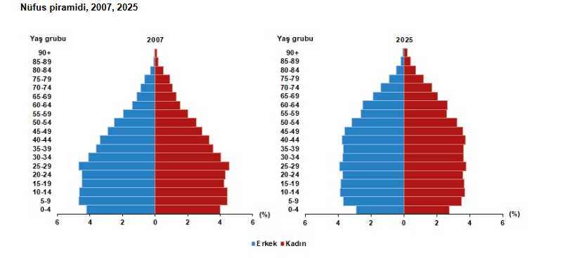 Çalışma çağı olarak tanımlanan 15-64 yaş grubundaki nüfusun oranı, 2007 yılında yüzde 66,5 iken 2025 yılında yüzde 68,5 oldu. Diğer yandan çocuk yaş grubu olarak tanımlanan 0-14 yaş grubundaki nüfusun oranı yüzde 26,4'ten yüzde 20,4'e gerilerken, 65 ve daha yukarı yaştaki nüfusun oranı ise yüzde 7,1'den yüzde 11,1'e yükseldi.
