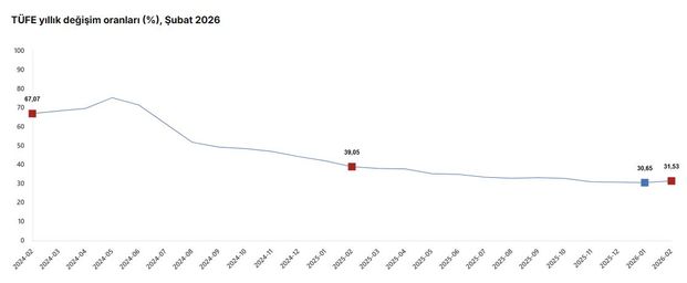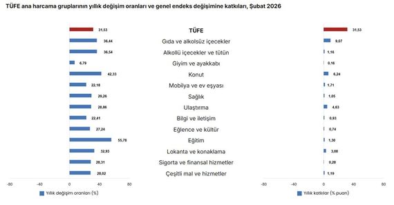 Türkiye İstatistik Kurumu (TÜİK), 2026 yılının şubat ayına ait enflasyon verilerini paylaştı. Açıklanan verilere göre, Tüketici Fiyat Endeksi aylık bazda yüzde 2,96 olurken, yıllık bazda yüzde 31,53 oldu.