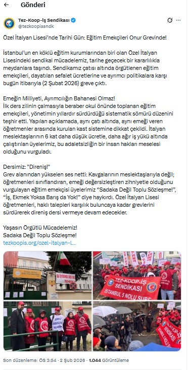 İstanbul’un en köklü eğitim kurumlarından biri olan Özel İtalyan Lisesinde derslere grev arası verildi.