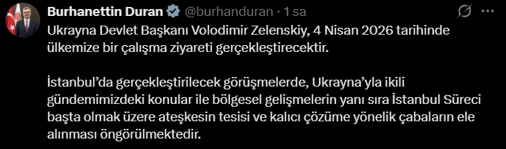 İletişim Başkanı Burhanettin Duran, sosyal medya hesabı üzerinden yaptığı açıklamada Ukrayna Devlet Başkanı Volodimir Zelenskiy’nin Türkiye ziyaretiyle ilgili detayları paylaştı. Duran, yaptığı bilgilendirmede, "Ukrayna Devlet Başkanı Volodimir Zelenskiy, 4 Nisan 2026 tarihinde ülkemize bir çalışma ziyareti gerçekleştirecektir. İstanbul’da gerçekleştirilecek görüşmelerde, Ukrayna’yla ikili gündemimizdeki konular ile bölgesel gelişmelerin yanı sıra İstanbul Süreci başta olmak üzere ateşkesin tesisi ve kalıcı çözüme yönelik çabaların ele alınması öngörülmektedir" ifadelerini kullandı. Ukrayna ve Rusya arasında devam eden çatışmaların gölgesinde gerçekleşen bu ziyaret, diplomatik çözüm arayışları açısından kritik bir öneme sahip.