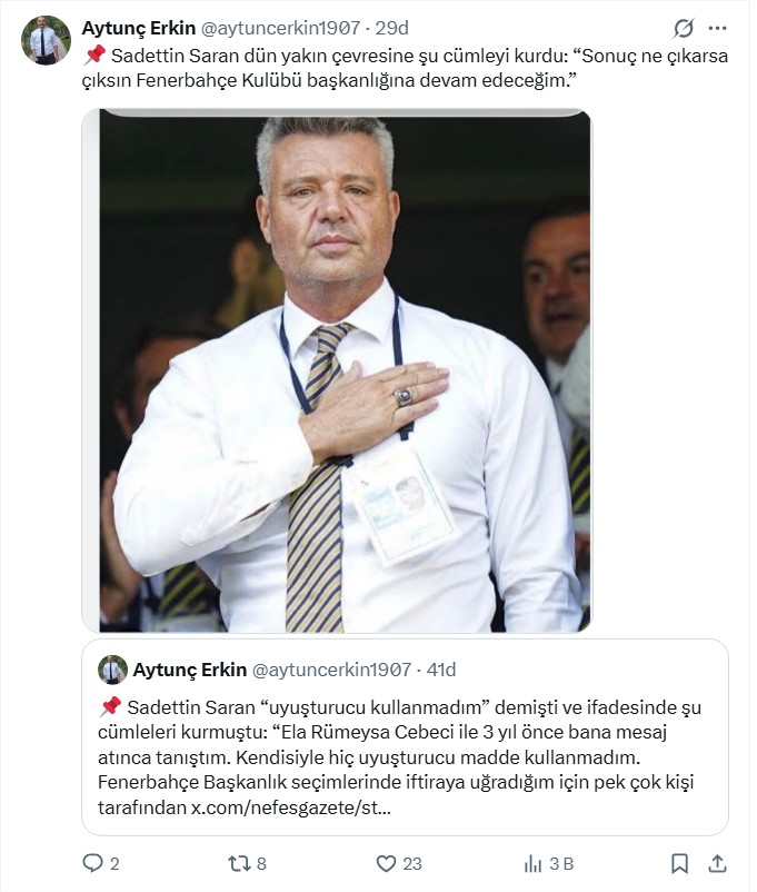 Gazeteci Aytunç Erkin, sosyal medya paylaşımında Saran’ın, “Sonuç ne çıkarsa çıksın Fenerbahçe Kulübü başkanlığına devam edeceğim” dediğini aktardı.