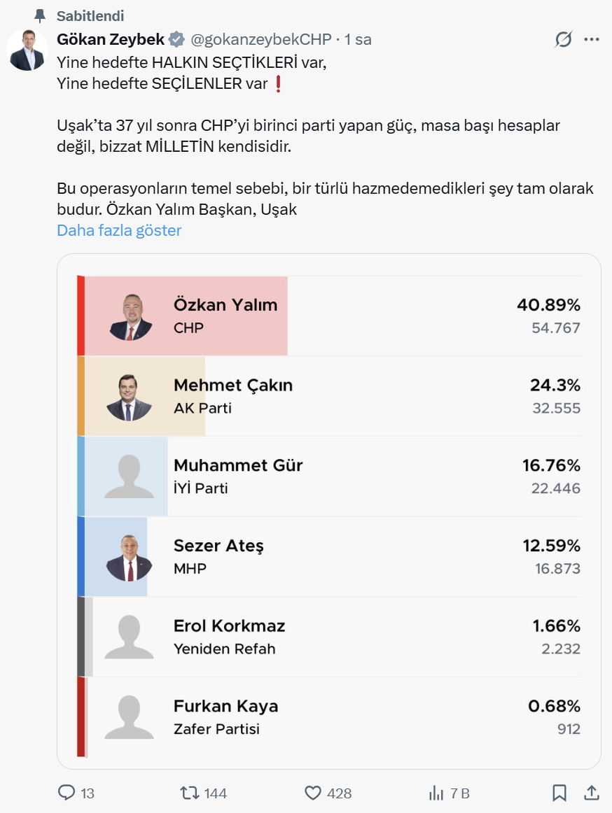 CHP Yerel Yönetimlerden Sorumlu Genel Başkan Yardımcısı Gökan Zeybek, Uşak Belediyesi'ne yönelik operasyonun siyasi olduğunu dile getirdi. X hesabından yaptığı paylaşımda Zeybek, Yalım'ın gözaltına alınma nedeni olarak, CHP'nin Uşak'ta 37 yıl sonra birinci parti olarak çıkmasını gösterdi.