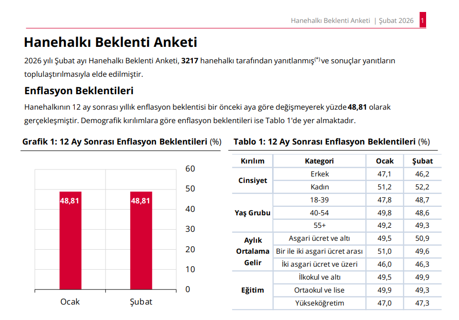 Türkiye Cumhuriyet Merkez Bankası’nın (TCMB) ilk kez yayımladığı Hanehalkı Beklenti Anketi sonuçlarına göre, hanehalkının 12 ay sonrasına ilişkin yıllık enflasyon beklentisi bir önceki aya kıyasla değişim göstermeyerek yüzde 48,81 seviyesinde sabit kaldı.