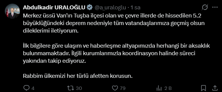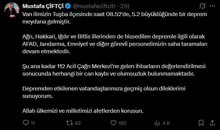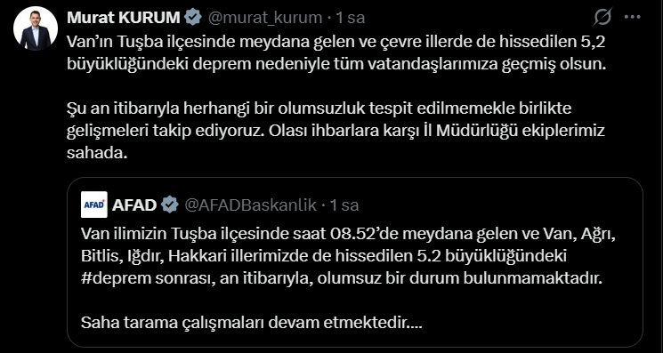 İçişleri Bakanı Mustafa Çiftçi, sosyal medya hesabı üzerinden yaptığı açıklamada, 112 Acil Çağrı Merkezi’ne ulaşan herhangi bir olumsuz ihbarın bulunmadığını duyurdu. Bakan Çiftçi, " Van ilimizin Tuşba ilçesinde 5.2 büyüklüğünde bir deprem meydana gelmiştir. Ağrı, Hakkari, Iğdır ve Bitlis illerinden de hissedilen depremle ilgili olarak AFAD, Jandarma, Emniyet ve diğer görevli personelimizin saha taramaları devam etmektedir. Şu ana kadar 112 Acil Çağrı Merkezi'ne gelen ihbarların değerlendirilmesi sonucunda herhangi bir can kaybı ve olumsuzluk bulunmamaktadır. Depremden etkilenen vatandaşlarımıza geçmiş olsun dileklerimi sunuyorum. Allah ülkemizi ve milletimizi afetlerden korusun" ifadelerini kullandı.