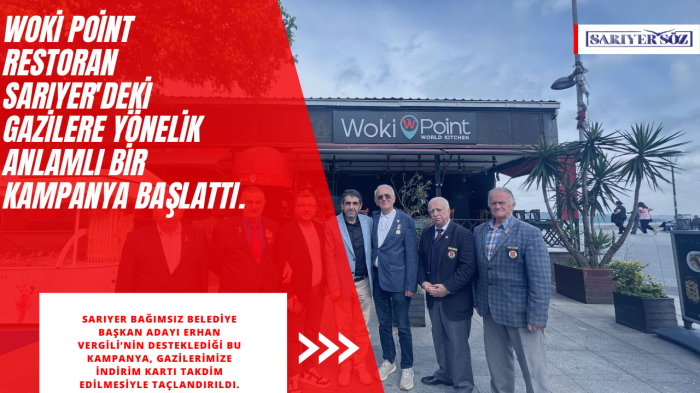 Woki Point Restoran, Sarıyer'deki gazilere yönelik anlamlı bir kampanya başlattı. Sarıyer Bağımsız Belediye Başkan Adayı Erhan Vergili’nin desteğiyle hayata geçirilen bu kampanya kapsamında, gazilerimize %20 indirim sunuluyor. Bu kampanya, gazilerimizin Woki Point Restoran’da yapacakları tüm yemeklerde geçerli olacak.
