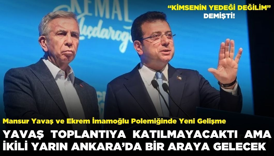 Ankara Büyükşehir Belediye (ABB) Başkanı Mansur Yavaş, Cumhurbaşkanlığı adaylığı sürecini başlatan İstanbul Büyükşehir Belediye (İBB) Başkanı Ekrem İmamoğlu'nun Ankara toplantısına katılmayacağını açıklayarak, "Kimsenin yedeği değilim, kendimi o konuma düşürmem" demişti. Yavaş ve İmamoğlu'nun, yarın saat 11.00'de Ankara Büyükşehir Belediyesi'nde bir araya geleceği öğrenildi.