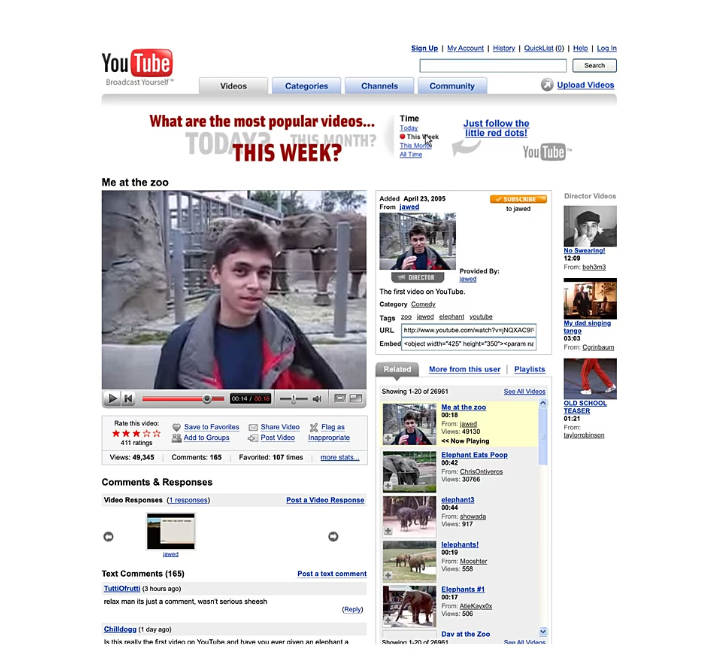 San Diego Hayvanat Bahçesi'ndeki filleri konu alan "Me at the zoo" (Ben hayvanat bahçesindeyim) başlıklı 19 saniyelik klip, 23 Nisan 2005 tarihinde paylaşıldı. Video, o dönemde 25 yaşında olan YouTube'un kurucu ortağı Jawed Karim'i fillerden söz ederken gösteriyor.